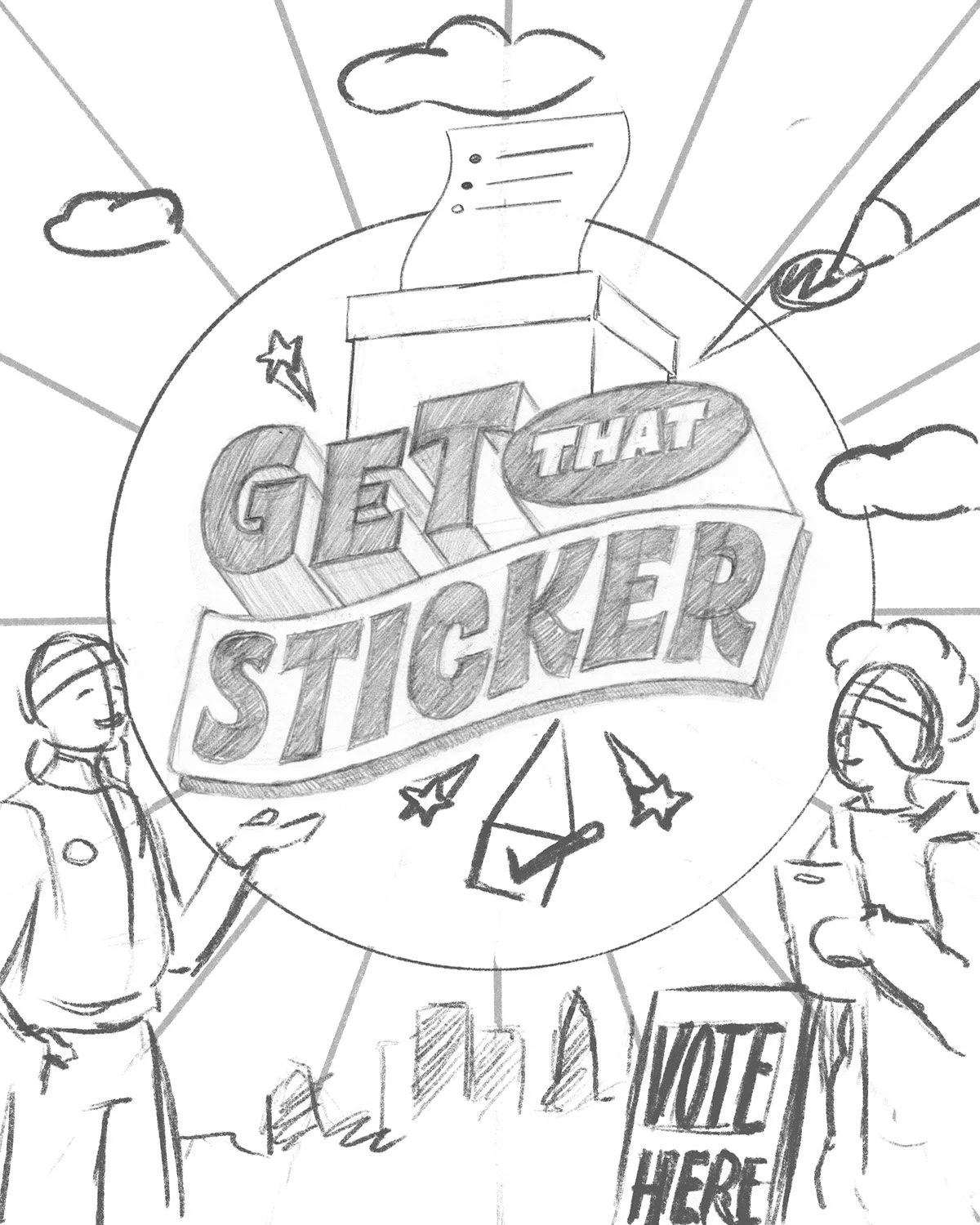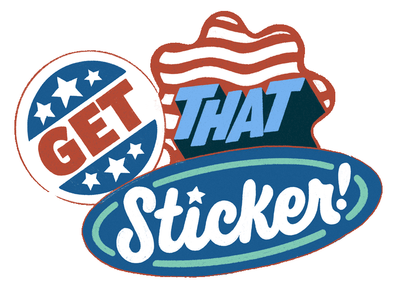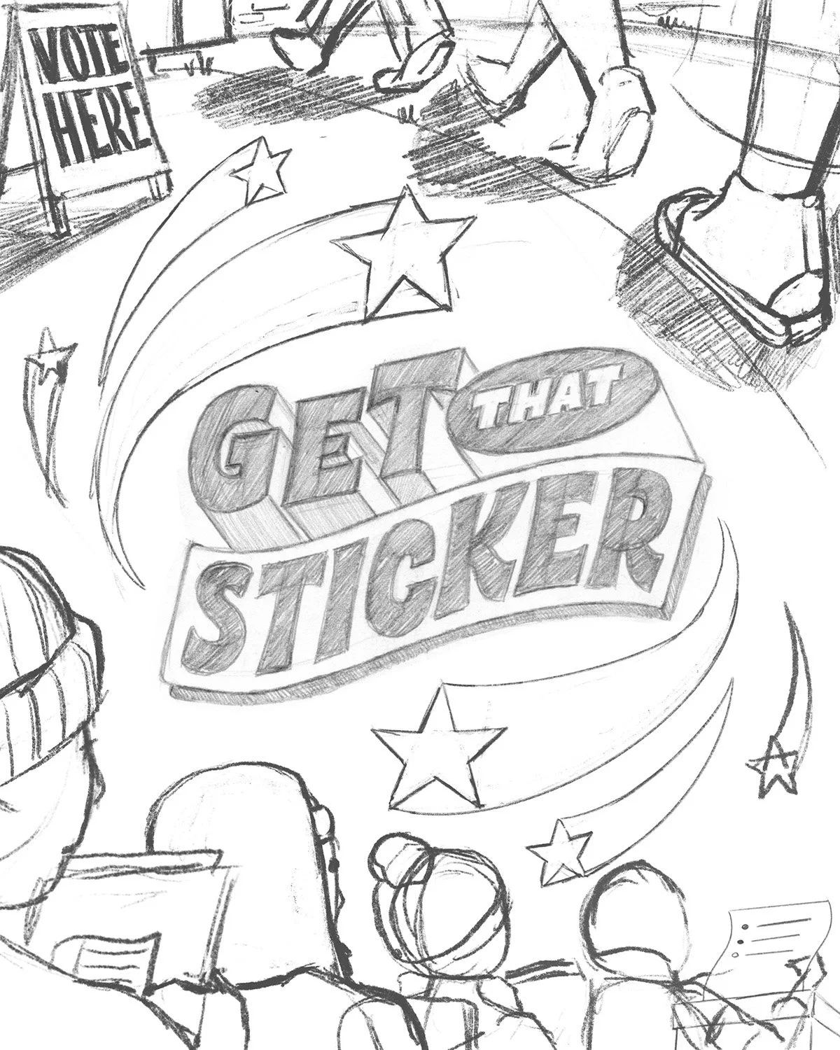 I was enlisted along with 4 other Michigan based artists (Bill Ferenc, Rachelle Baker, Octavia Ink, and Lauren Hom) to work on a campaign to raise awareness about expanded voting options in our state. Four of us were assigned a voting persona which represented one method for casting your vote. My slogan was “Get That Sticker,” for casting your ballot in person on election day. We each were given a main color to work with; mine was orange. The artwork and its elements were used as posters and in mailings leading up to the 2024 election.